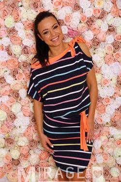 Akiknek a Mirage előző ruhája „túl sok” is megtalálhatják a számukra megfelelőt. A Mirage Miquel derekán és nyakán megkötős csíkos ruha már sokkal visszafogottabb darab. Sötétkék alapon színes csíkok vannak, ami miatt nagyon fiatalossá teszi a megjelenést. Felül lazább, alul passzos fazonú.