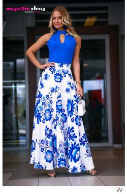 A Mystic day fehér alapon királykék virágmintái még mindig lenyűgöznek bennünket! Számos szabású és stílusú ruhákat készítettek el ebből a mintából. A királykék-fehér kombináció más összeállításaikban is megjelenik. Ezekből mutatunk be párat. Mystic Day Viva mintás top hordható az ugyanolyan mintás szoknyával is. Viszont akinek ez túl sok minta hordhatja ezt a szoknyát a Mystic Day Viva királykék toppal. Mindkét felső nagyon nyárias Mystic Day felső, poliamid anyaguknak köszönhetően nyáron is szellős és kényelmes viseletet nyújt. Csepp alakú dekoltázskivágása igazán szexi és nőies.
