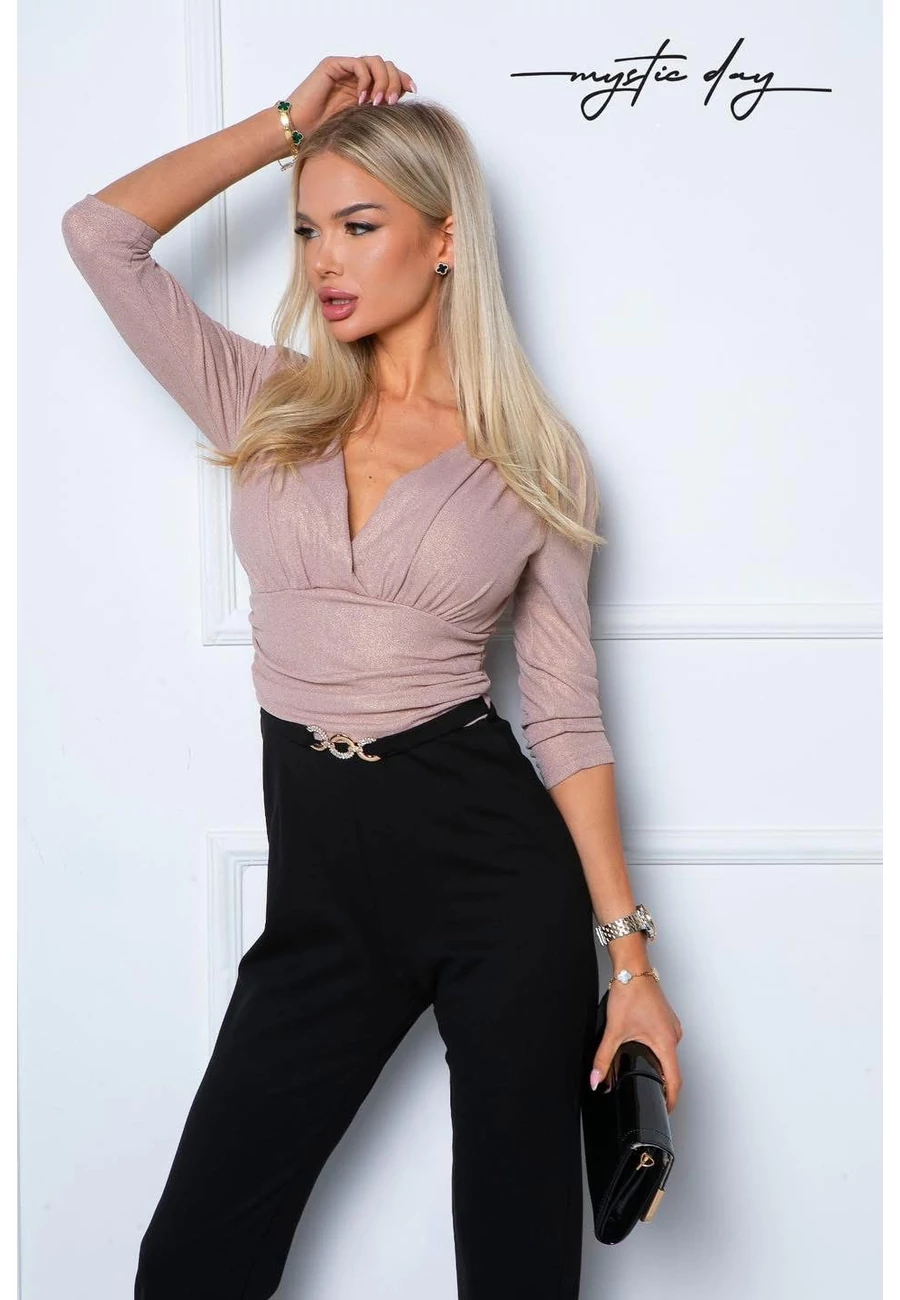 Elegáns megjelenésű, válltöméses, elöl átlapolt, hátul cipzáras,háromnegyedes ujjú, zsebes.