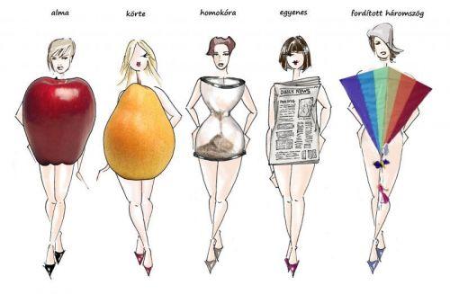 A nők alakját 5 nagy csoportba szokás sorolni, amelyeket úgy gondolom, elég sokan ismerünk. Ezek az alma, a körte, a fordított háromszög, a homokóra és az egyenes. Természetesen nem vagyunk egyformák, így ezeknek mindenféle kombinációja is előfordul.