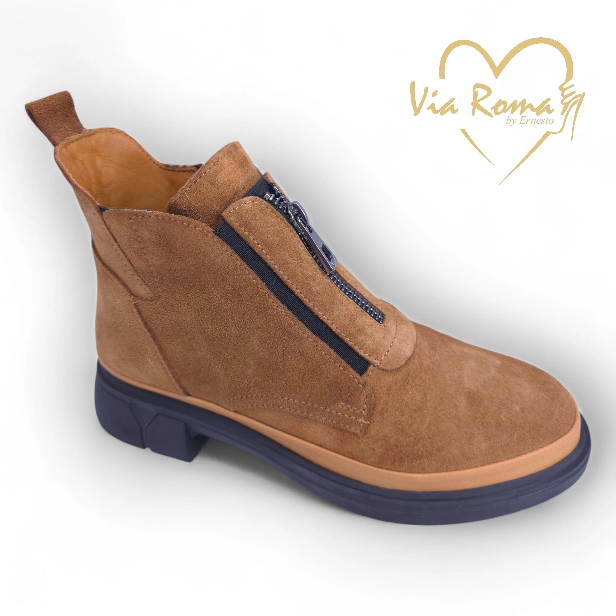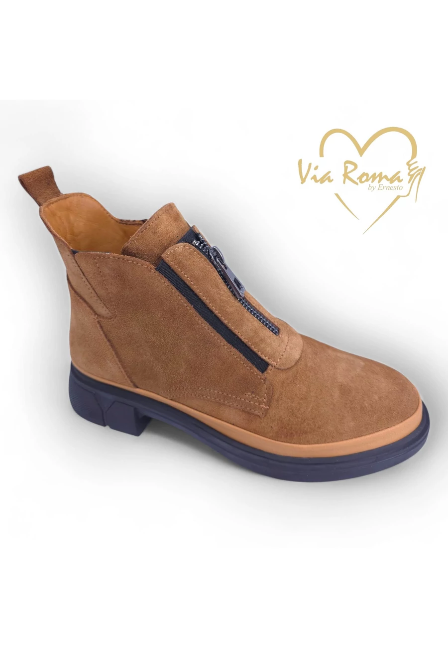 Via Roma bőr bokacsizma, teve barna színben, belül cipzáras, elöl is állítható cipzárral, alatta gumi betéttel.vékonyan bélelt.