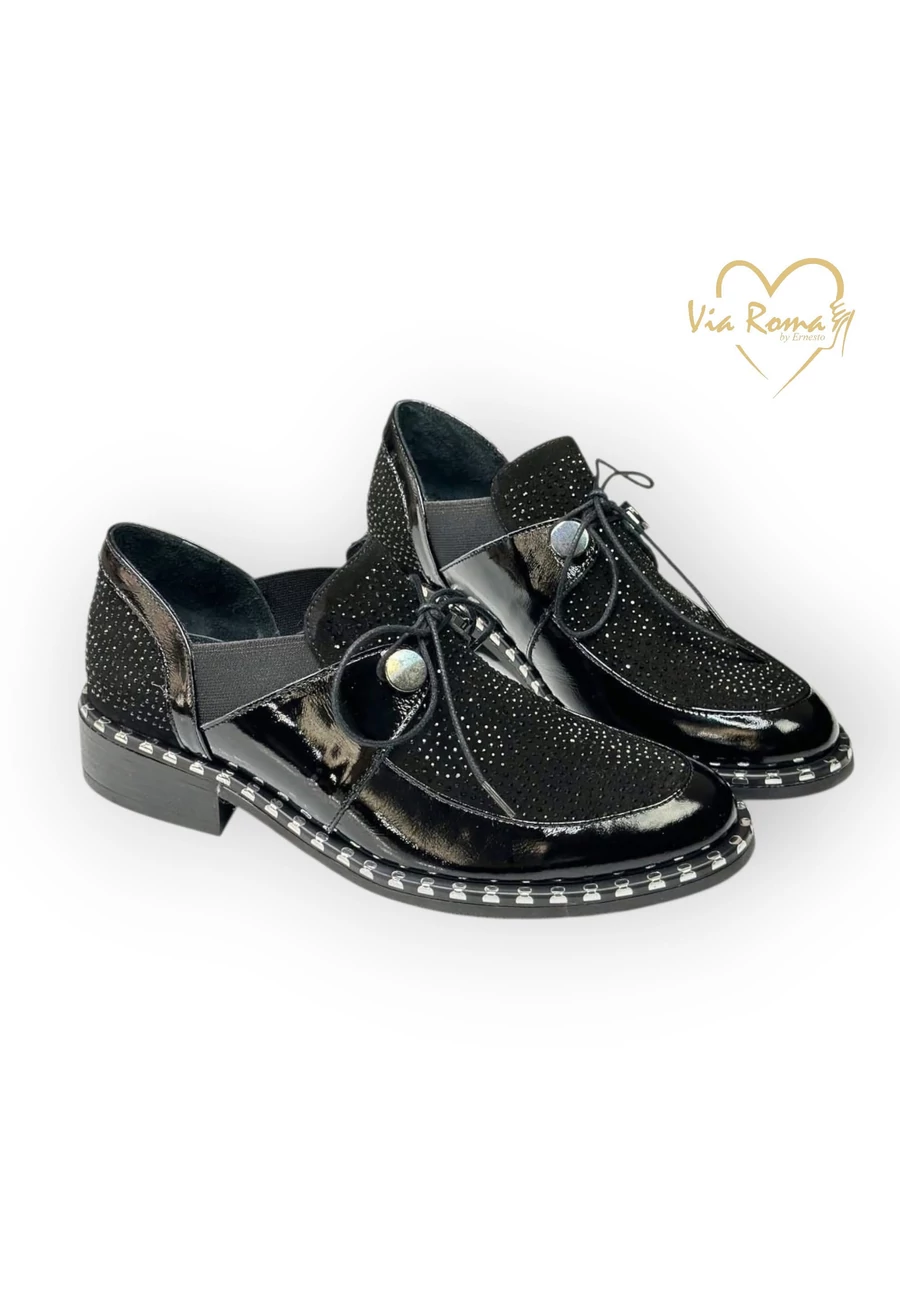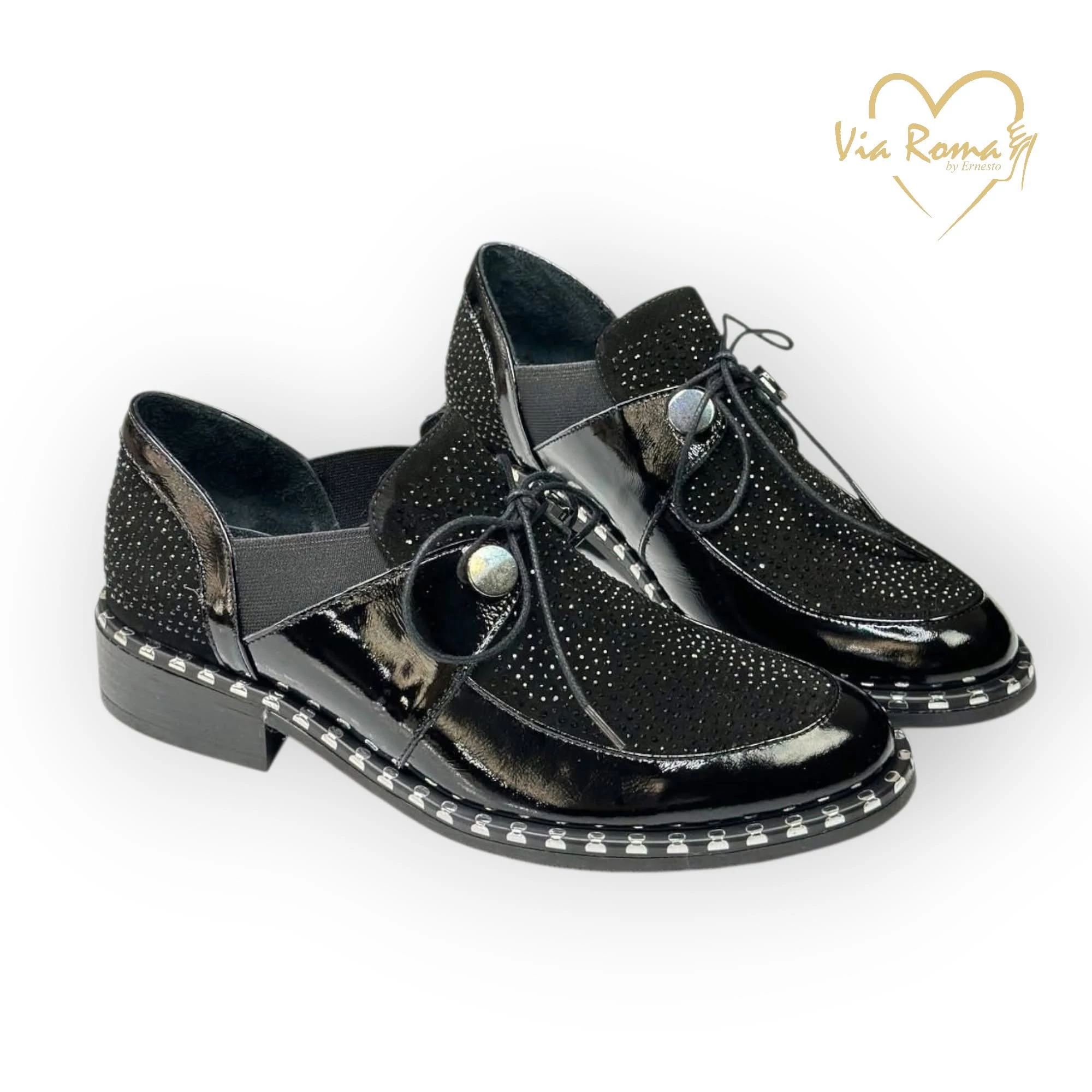 | VIA Roma fekete lakkbőr cipő, extra vagáns, egyedi fazon, fűzős. Belső talprésze is bőr. | |