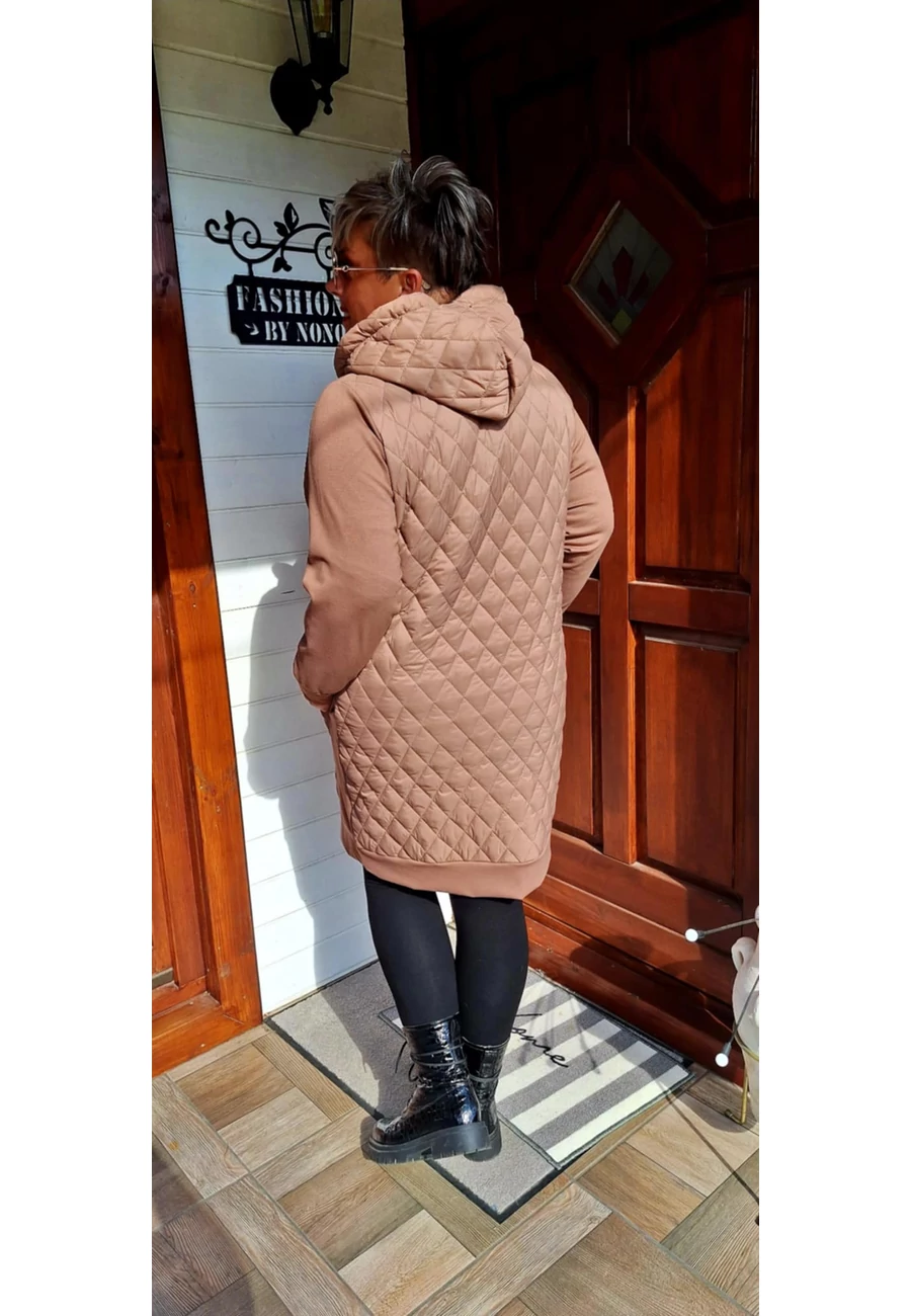 Átmeneti steppelt kabát, vatelinnel bélelt,karcsúsít, kapucnis , zsebes, az ujja pamuthoz hasonló anyag. Mogyoró barna színben.