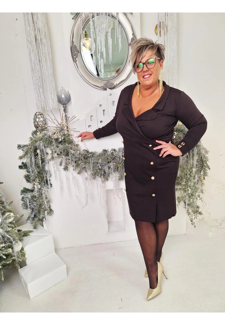 Alkalmi ruha, XL-től 4XL-ig, sötétbarna színben, jó tartású, nem túl rugalmas anyag, arany gombokkal díszítve.