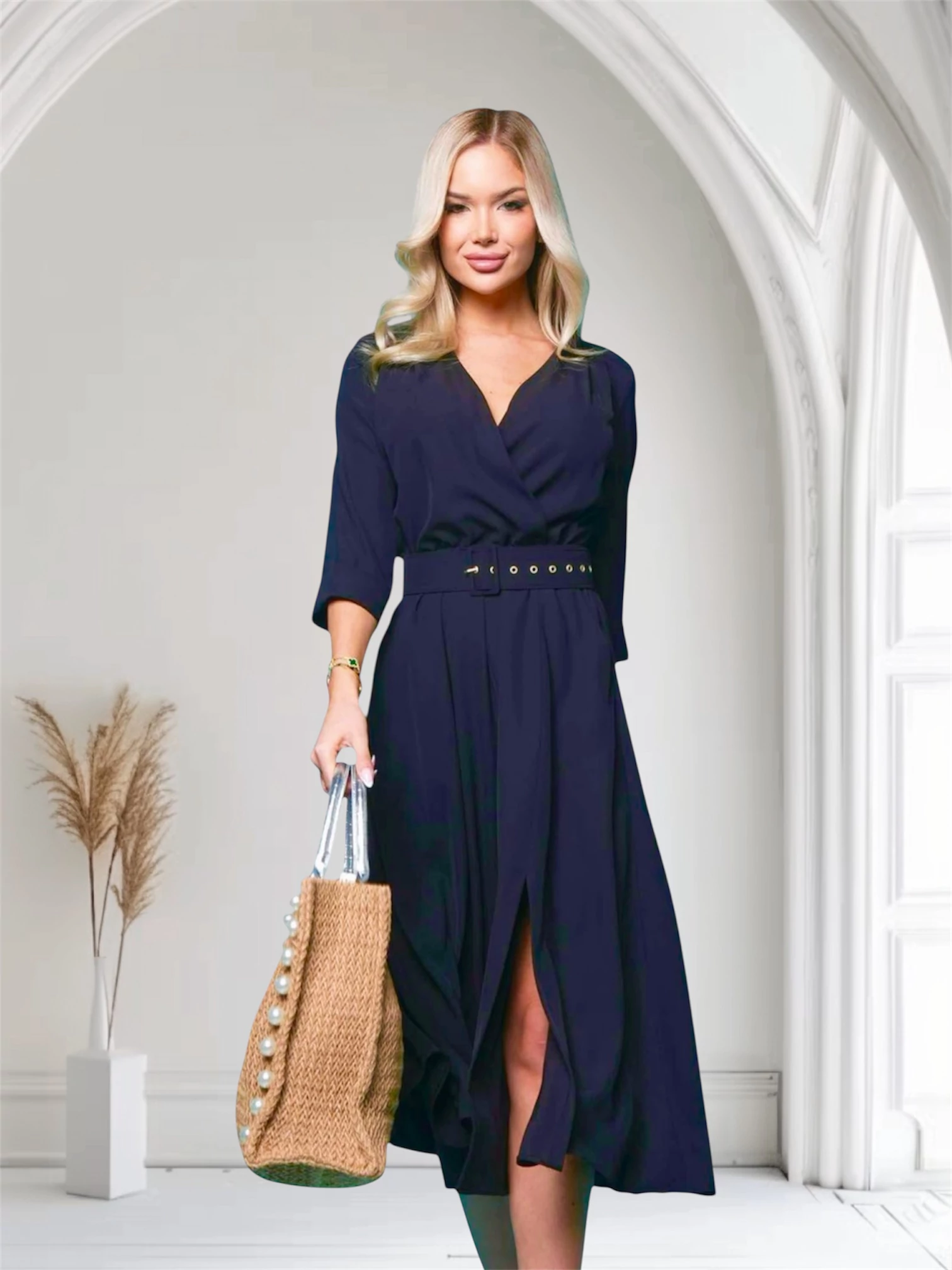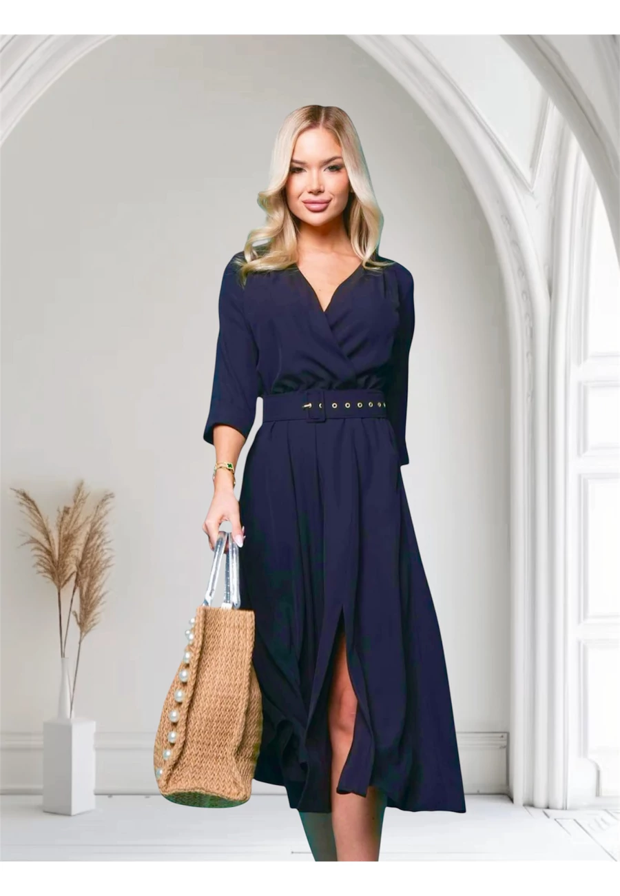 Akár hétköznapi, vagy alkalmi viselet is lehet, sötétkék színben, nagyon könnyű selymes tapintású anyag, hátul cipzáras, hozzá tartozó övvel. |