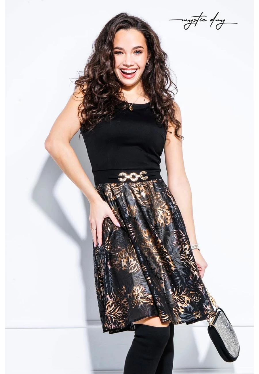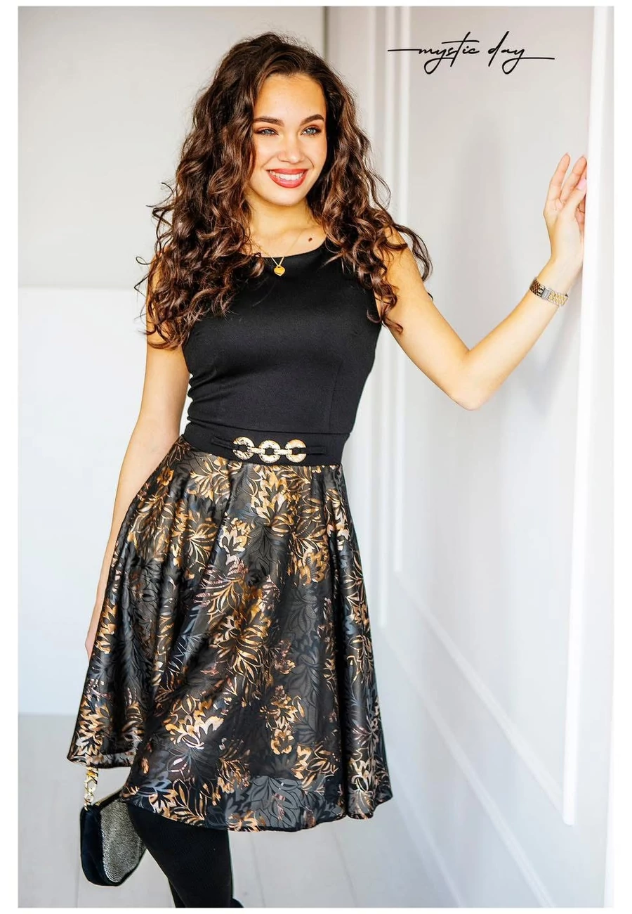 Testhez álló, ujjatlan, felső része rugalmas pamutos tapintású anyag, alsó része selyem , tél színekkel, alsó szoknyája arany színű szatén anyagú. Hátul cipzáras.