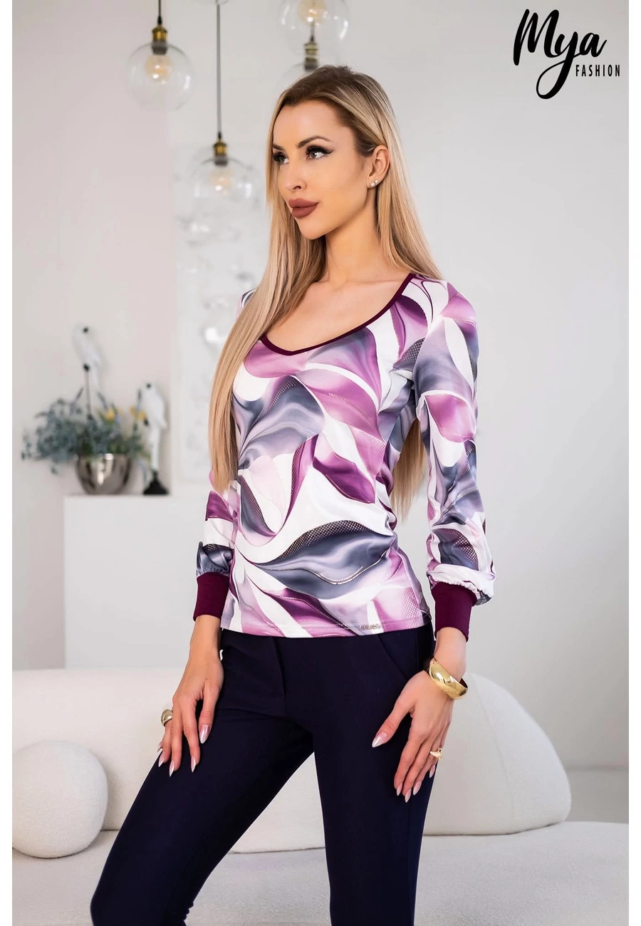 Luisa felső, lilás árnyalatokkal, padlizsán színű passzéval. Az ujja enyhén buggyos.