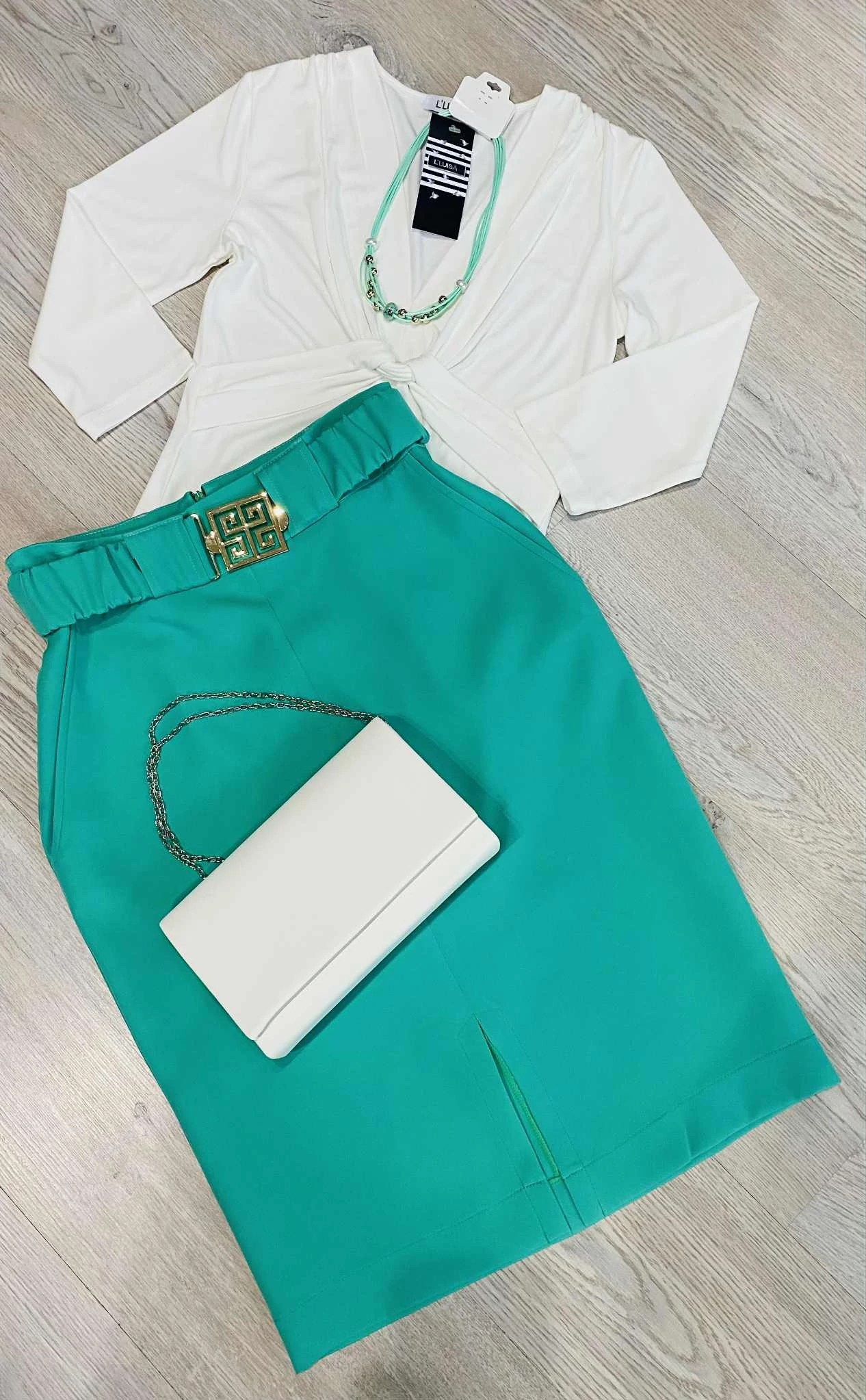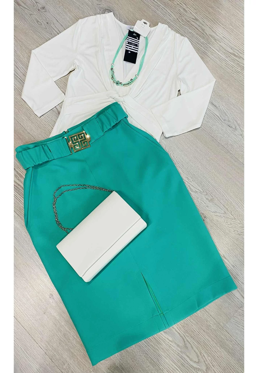 Mystic Day ceruza szoknya, türkiz zöld színben, elöl középen felsliccelt, hozzá tartozó gumis övvel. |