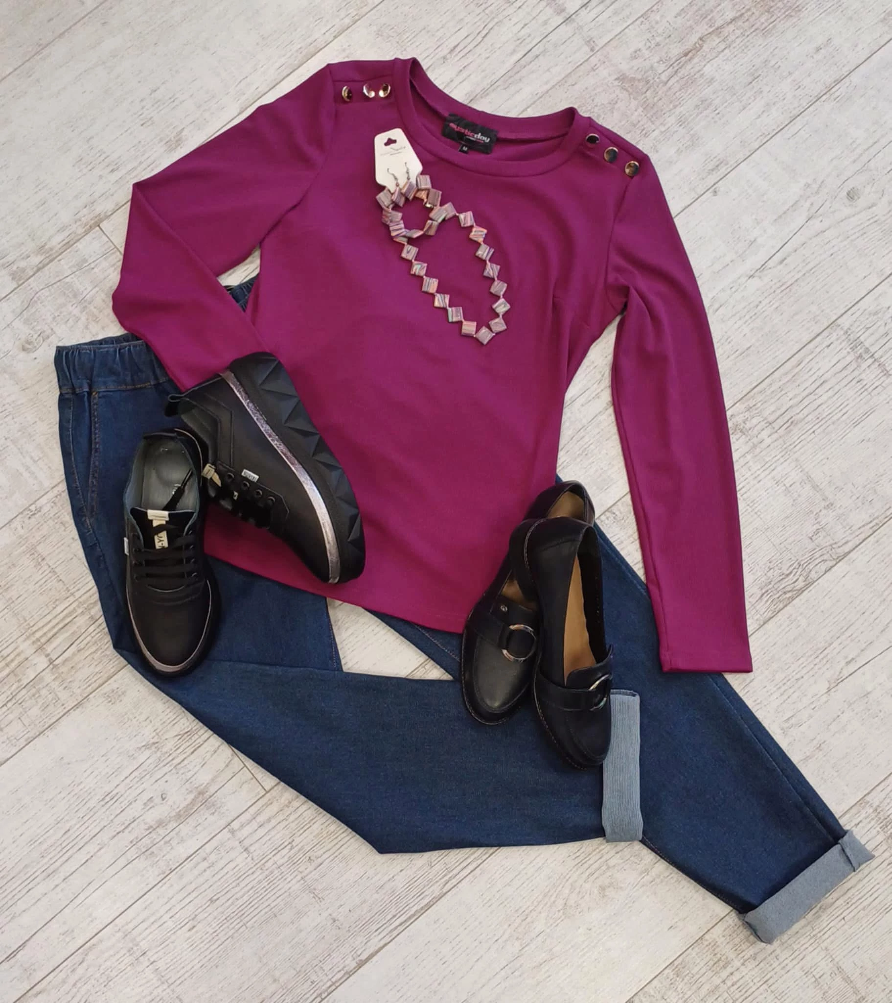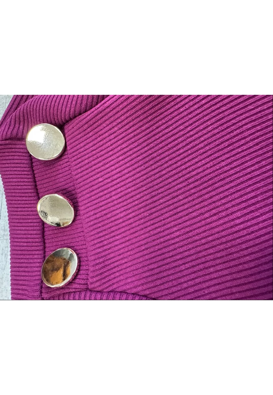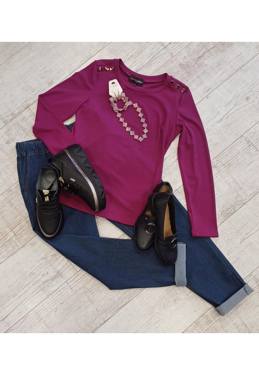 Rugalmas puha anyagú testhez álló felső, vállán díszgombokkal.