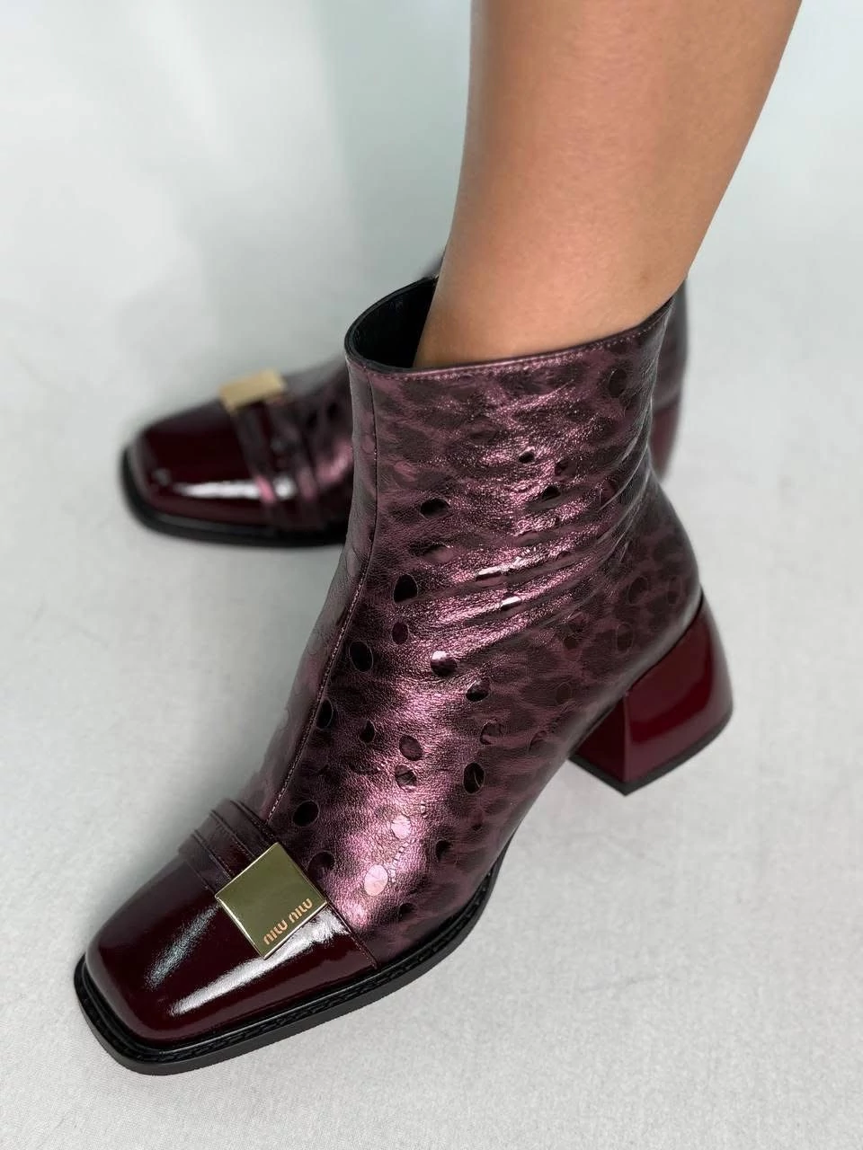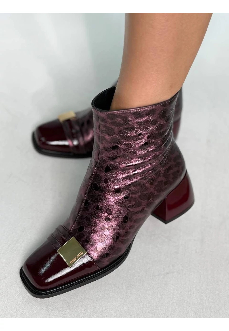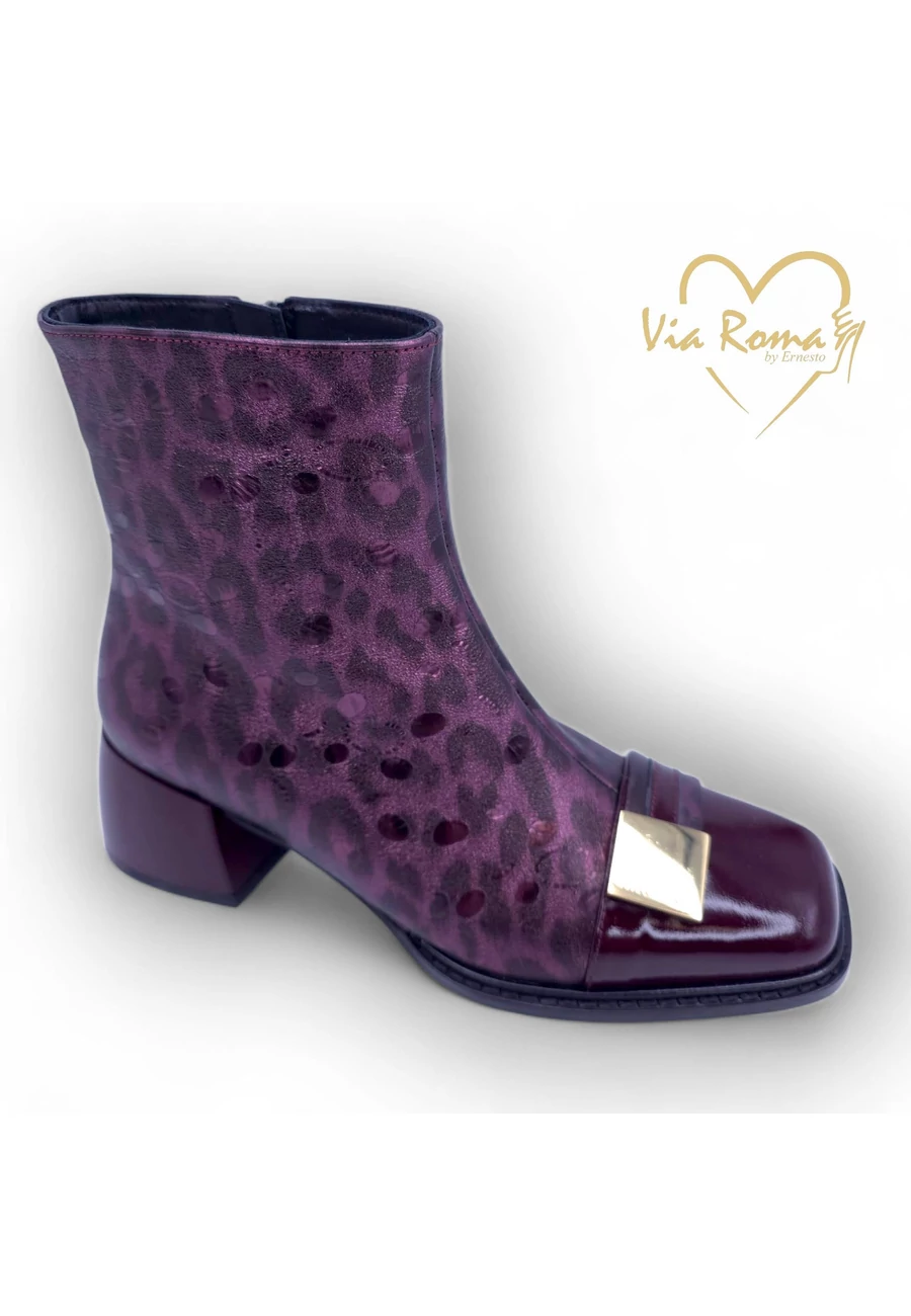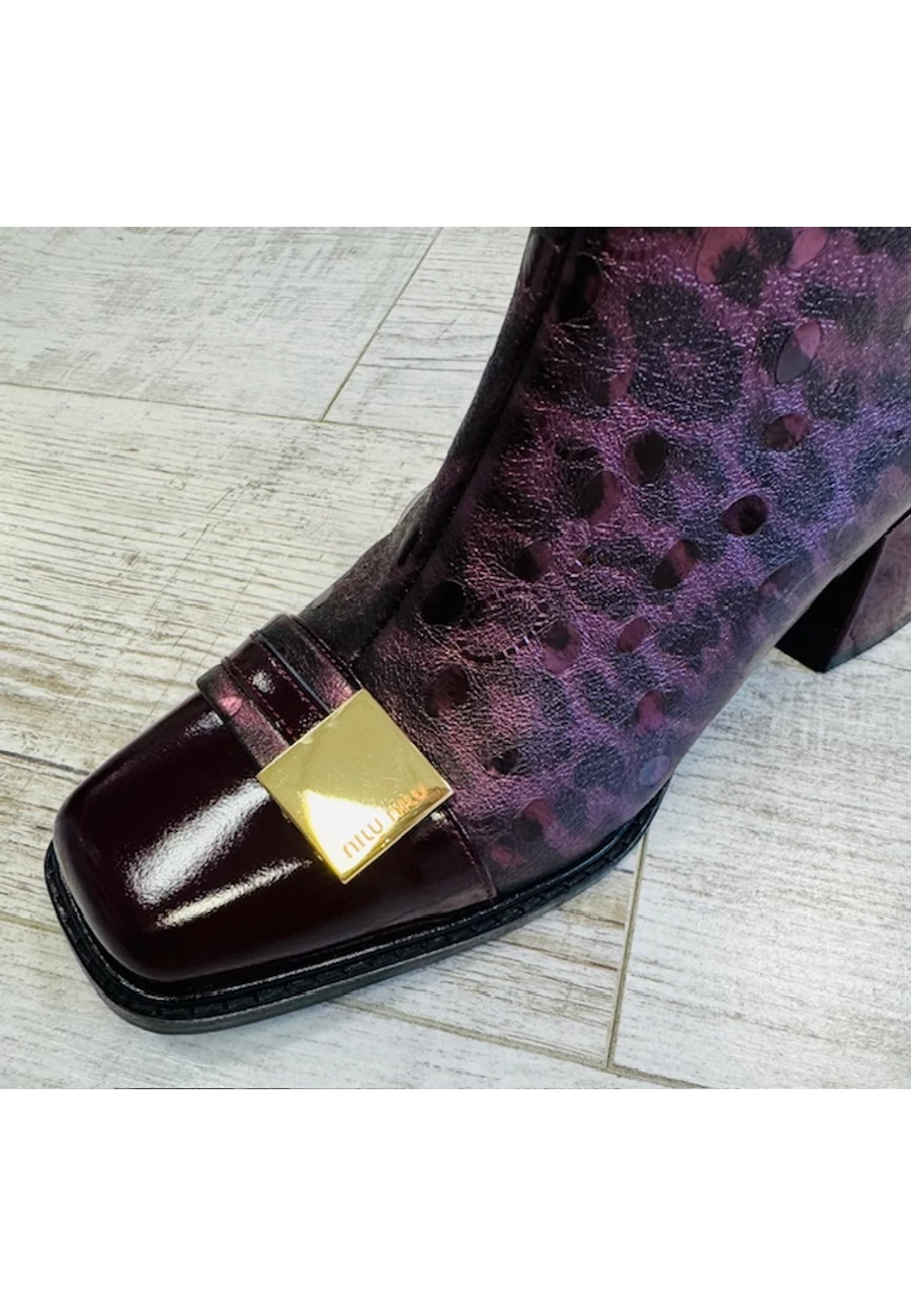Elegáns bordó bőr bokacsizma, saját színében ocelot mintás, 5 cm-es sarokkal, vékony puha béléssel. lekerekített kocka sarokkal. |